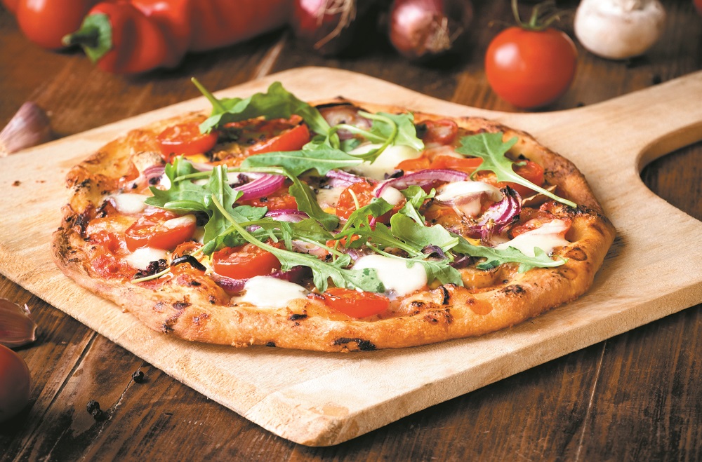 Salad pizza: Brush the dough with olive oil. Place sliced tomatoes, then mozzarella slices, sliced mushroom, shrimp and a sprinkle of oregano on the dough. After you remove the pizza from the oven, sprinkle it with lemon juice and spread fresh arugula on top to give the pizza a peppery, fresh dimension.