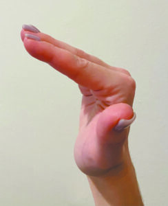 Dupuytren’s contracture is believed to be a hereditary condition that primarily affects the hands, although it also can affect the feet (known as Ledderhose disease). The first signs are small palpable nodules and cords in the palm of the hand. For some people, this may be the only symptom that occurs throughout their lifetime. But for others, it can progress into fixed bent positions of the fingers, otherwise known as flexion contractures. It can affect one or multiple fingers in one or both hands, and the progression can be aggressive or slow in nature.