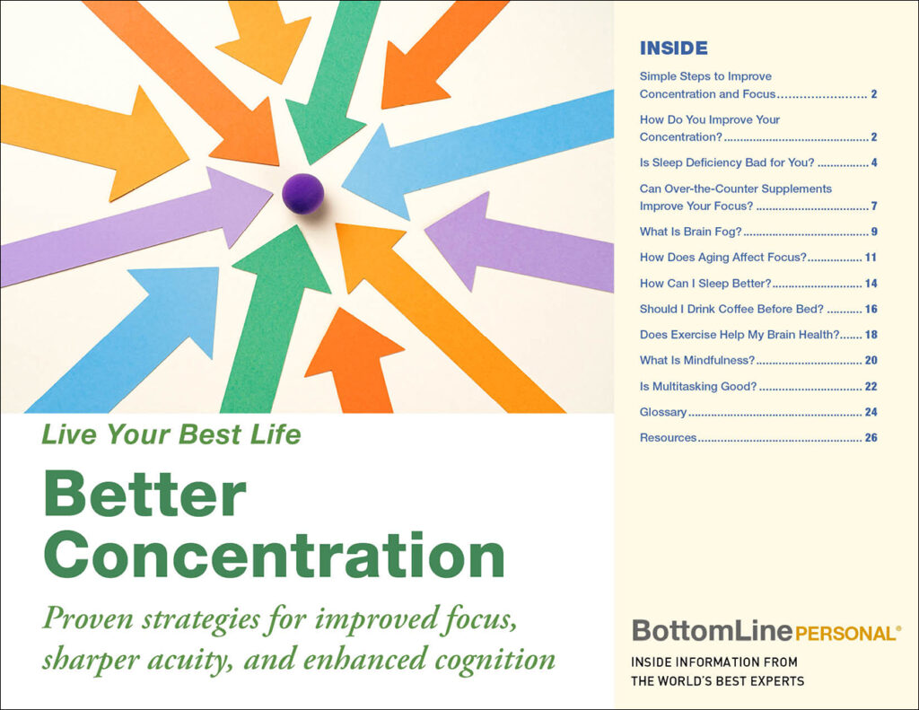 Frankly, it’s simple to fix sleep and vitamin deficiencies or add a few minutes more of physical activity or socialization into your day. These changes help boost your brain power and are contained in the secrets, tips, and advice from the experts you’ll discover in Bottomline Personal’s digital report Better Concentration.